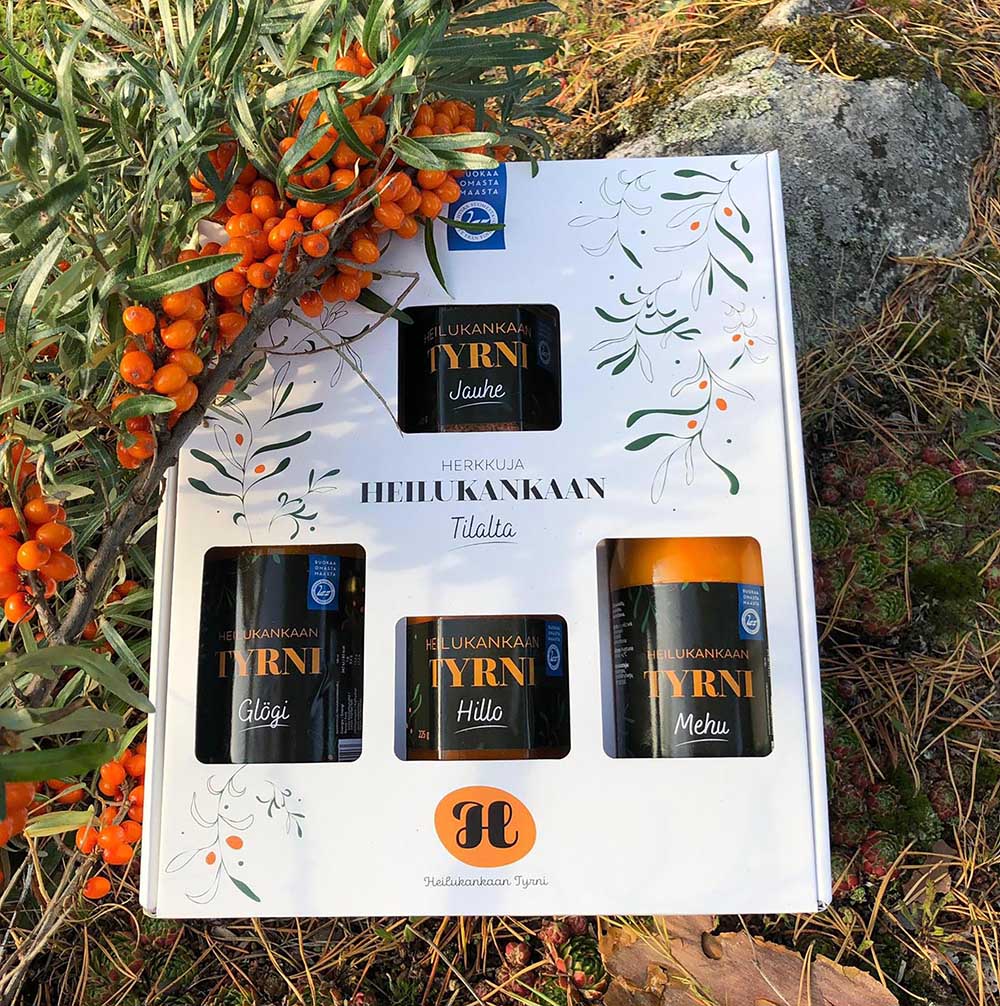 Tyrnimarjoista valmistetaan ainutlaatuista tyrniglögiä, 100 % tyrnitäysmehua, täyteläistä tyrnihilloa ja terveellistä tyrnijauhetta sekä neljän tuotteen lahjapakkausta, joka voitti Suomen ruokalahjakilpailun 2024.