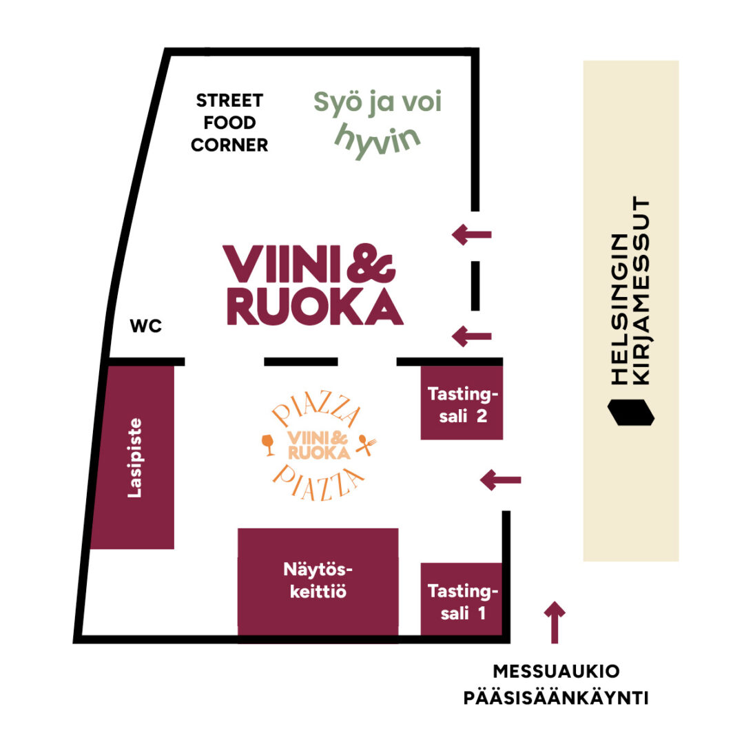 Viini & Ruoka -tapahtuman tapahtuma-alue sijaitsee Helsingin Messukeskuksessa Helsingin Kirjamessujen vieressä.